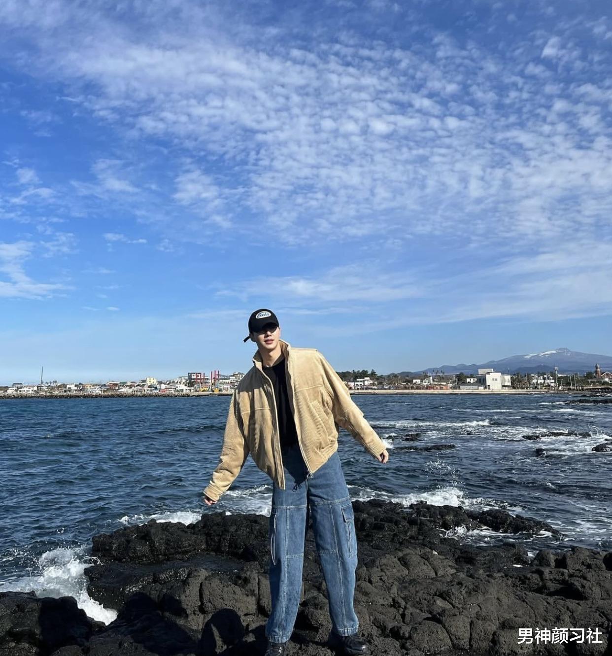 卡其色夹克是韩国男生衣橱的必备款。宋江用它来搭配黑色毛衣和牛仔裤,这种组合温暖且充满活力。最后,他一定会戴上一顶棒球帽,不仅能修饰脸型,更增添了随性自然的休闲感,是标准的韩系男友出街造型。