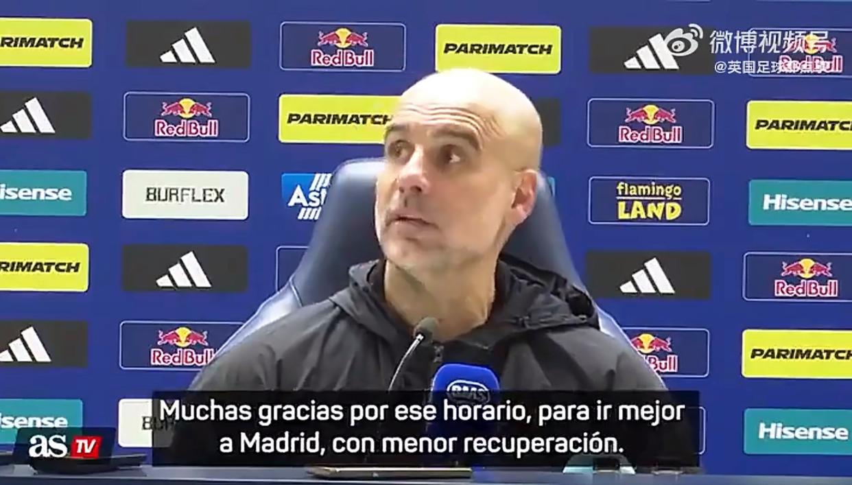 在球队1-0战胜利兹联的赛后发布会上,瓜迪奥拉用充满讽刺的语气,向赛程安排开炮,直言这让他们备战皇家马德里的时间变得更短了。