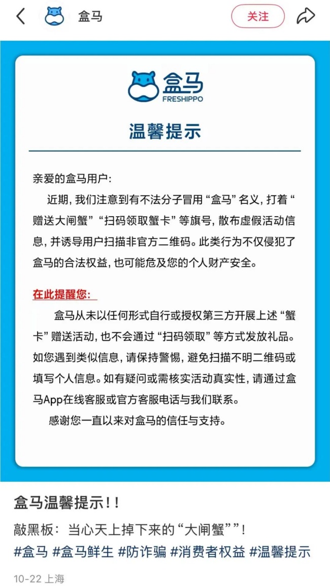 盒马相关负责人回应称,目前盒马未开展此类活动,请消费者务必提高警惕,切勿轻信此类信息,如有任何关于盒马活动的疑问及需要核实真假,可咨询盒马客服。