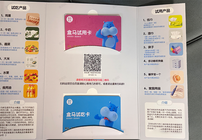 近日,多位网友在社交媒体发文表示,收到了盒马鲜生免费试吃卡,甚至有人称所在小区每层每户都有,直接挂在门把手上。而类似“试吃卡”、“试用卡”近期已经出现在了山东、浙江、安徽、广东、江西多地居民小区。