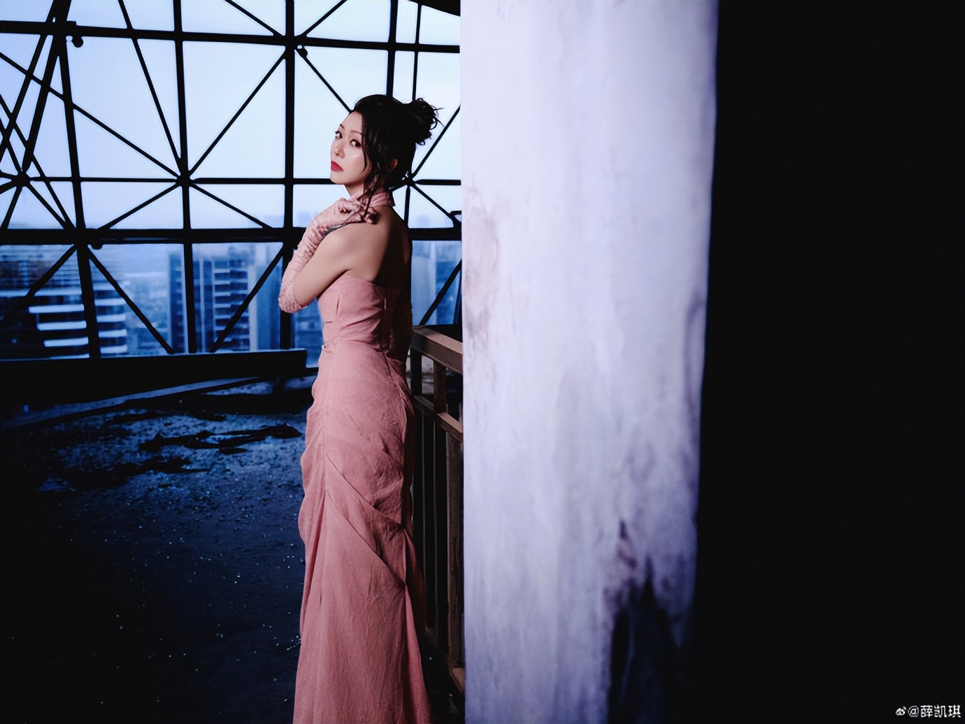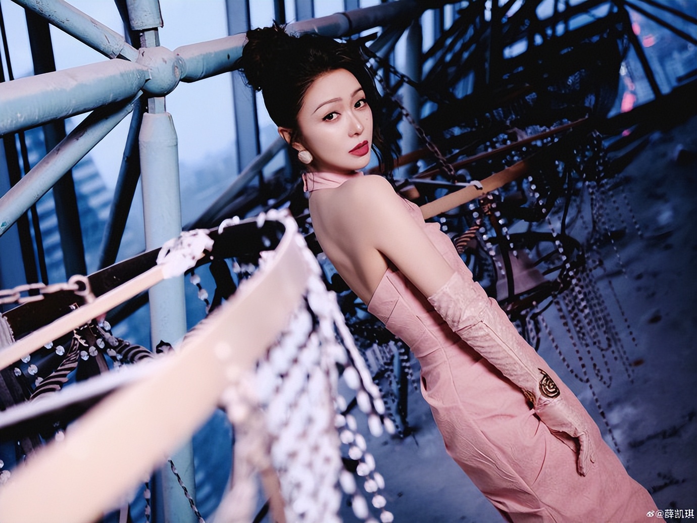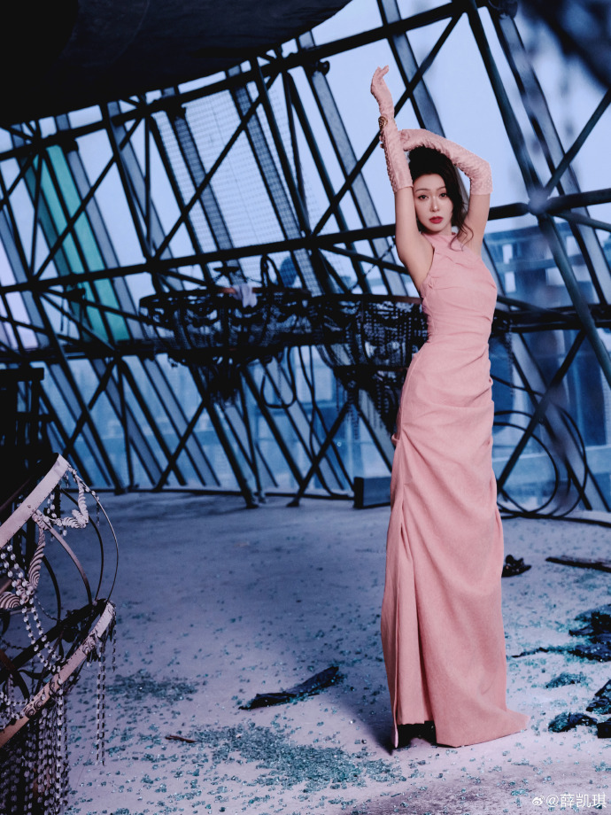 这张里,她穿的粉色单肩长裙是缎面材质,裙摆垂出流畅的弧度,一只手抬到头顶轻碰发顶。背景是交错的钢结构框架,玻璃反光里泛着金属冷光。团队说这是 “末日感” 布景,冷硬的钢架子确实衬得长裙的粉更柔,可她抬手的动作软乎乎的,连缎面的光都跟着暖起来,一点没有 “末日” 的疏离,反而像把甜偷偷揉进了钢架子的缝隙里。