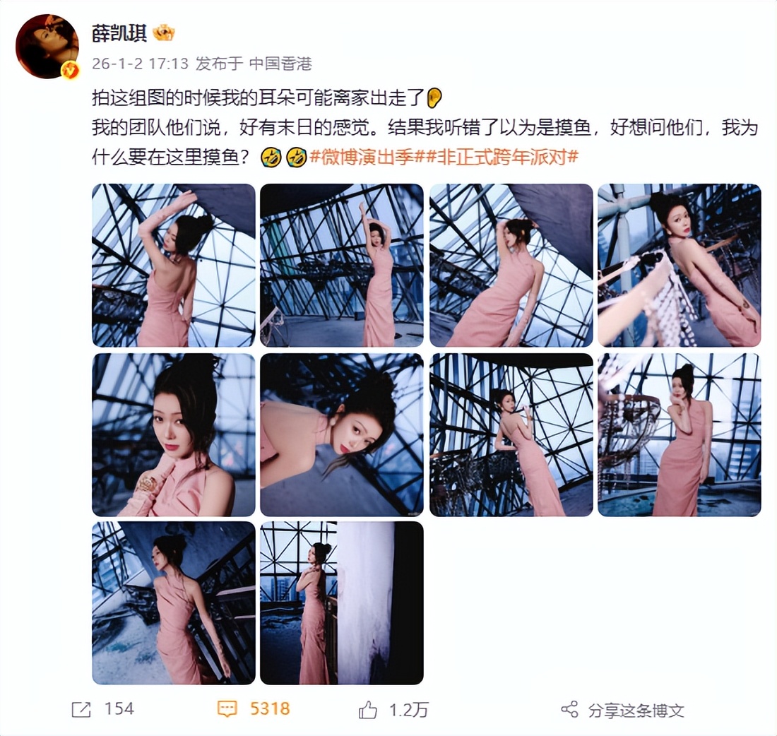 薛凯琪从出道起就带着 “甜而跳脱” 的气质,唱《奇洛李维斯回信》时是软萌少女,后来不管是演戏还是分享日常,都藏着股 “一本正经讲搞笑话” 的可爱。2026 年元旦她在香港发布的这组动态,粉色单肩长裙配冷硬的钢结构布景,文案里 “耳朵离家出走”“听错末日变摸鱼” 的碎碎念,刚好把她的甜和跳脱,揉进了工业风的冷硬里。