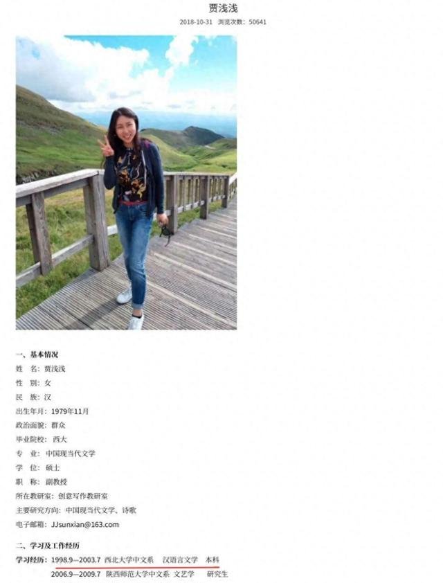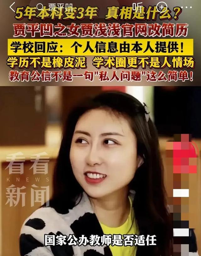 在舆论场上,有些人注定自带“流量体质”,但未必是因为他们有多优秀,而是因为他们的言行总能激起公众情绪的波澜。近日,贾平凹之女、西北大学文学院副教授贾浅浅再次凭借一份“缩水版简历”冲上热搜。原本她的本科学习时间是五年,如今却神奇地改成了三年。看似简单的数字调整,却像一块掉在水里的石头,掀起了巨大的涟漪。