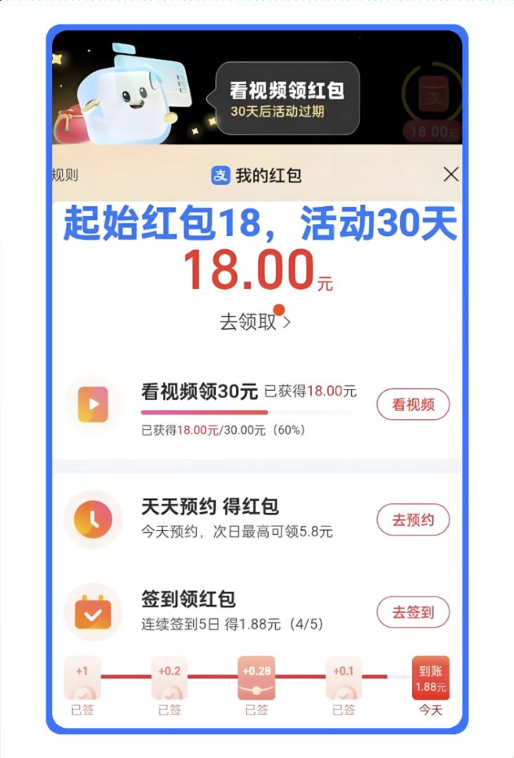 除了大家熟悉的余额宝,还有红包码、看视频任务等。比如红包码分享给身边的人,对方使用后,你可以直接拿到几毛到几块不等的奖励,钱会实时进入支付宝余额。