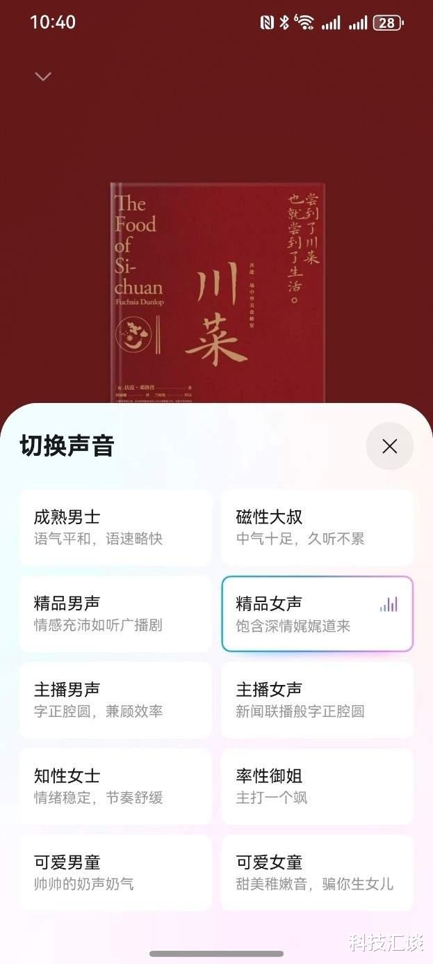 这几天我一边忙着抢票、订酒店,一边就用华为阅读的听书功能“云”游四方。我特别喜欢它的“精品女声”音色,完全不是冷冰冰的机器声,而是富有感染力的声音。听它描述着川菜的麻辣,绝对是一种精神会餐。