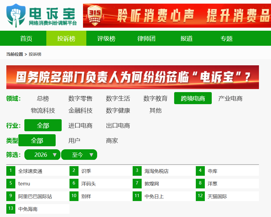 据网络消费纠纷调解平台“电诉宝”数据显示,2026年至今跨境电商领域的投诉事件按投诉量排序依次为:全球速卖通、识季、海淘免税店、寺库、temu、洋码头、敦煌网、洋葱、阿里巴巴国际站、别样、中免日上、天猫国际、中免海南。