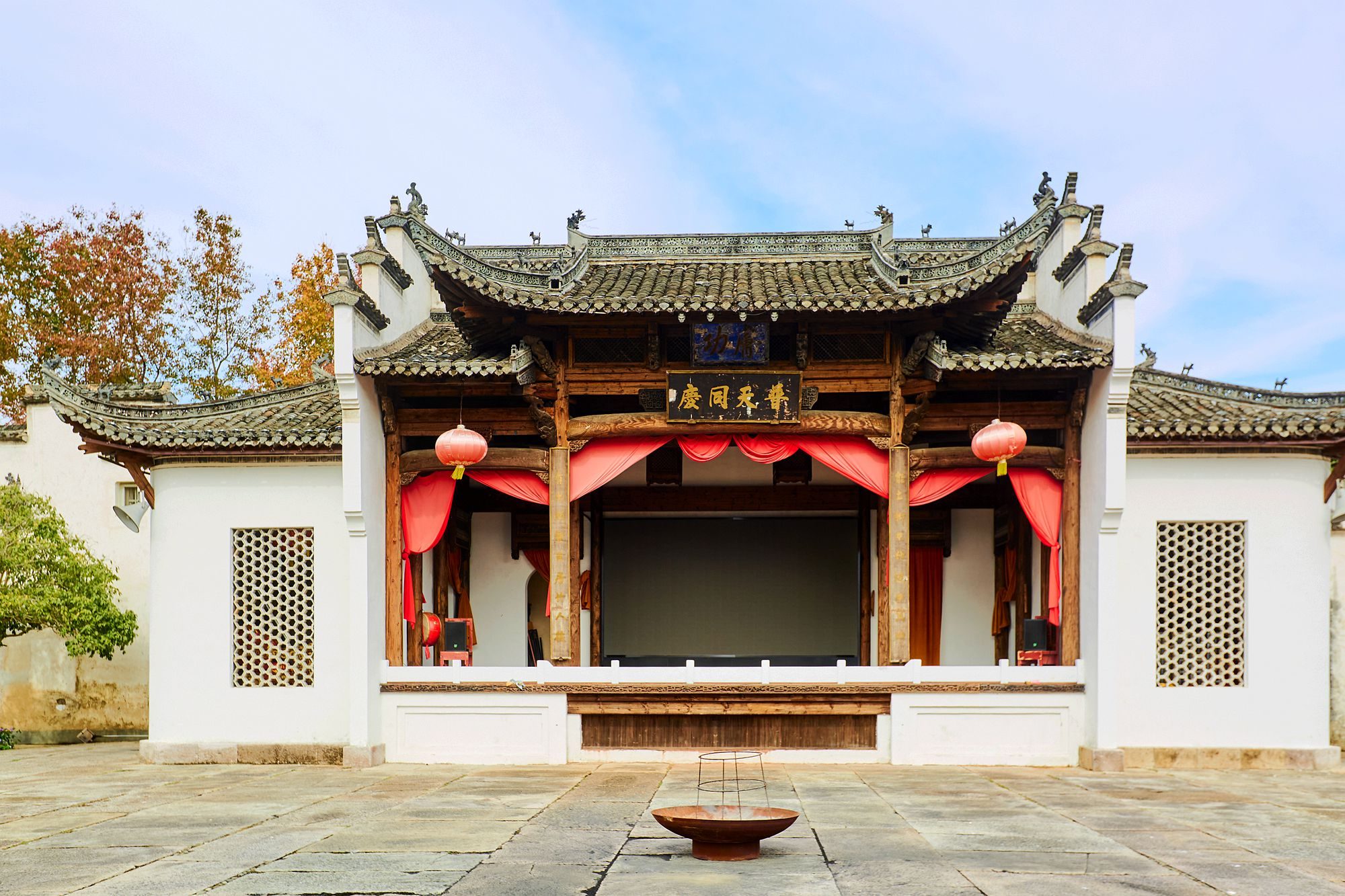 村中建筑都是从徽州其他古村落异地迁移而来的地道老宅子,古戏台也不例外。灰瓦覆着白墙,翘角上精雕细琢着瑞兽,红灯笼、红彩绸装扮着舞台,带上了浓浓的世俗感和烟火气。
