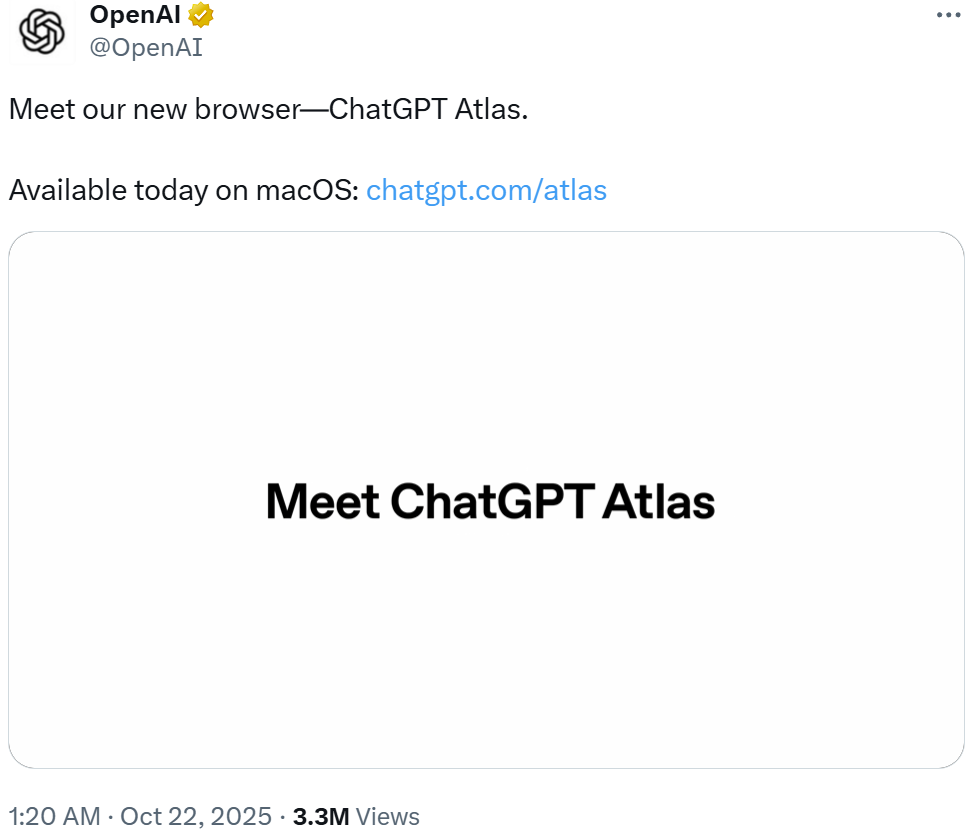 近日,OpenAI 发布了旗下首款由 AI 驱动的新型网页浏览器——ChatGPT Atlas,与谷歌的 Chrome 浏览器展开直接竞争。
