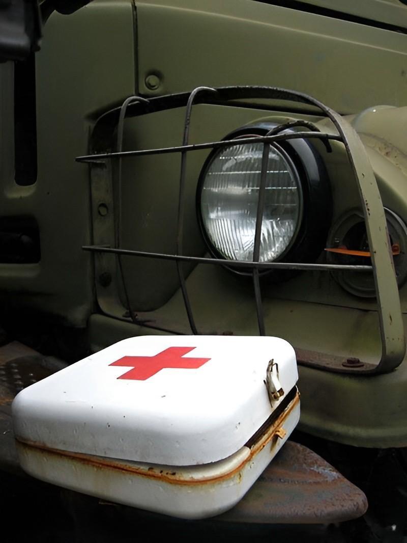 在一辆卡车的车头位置,放着一个铁制的白色医疗箱。箱子上红色的十字十分明显。