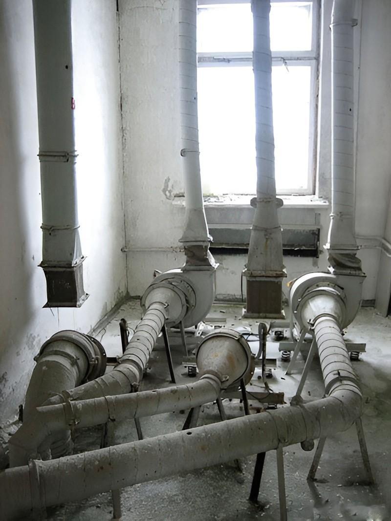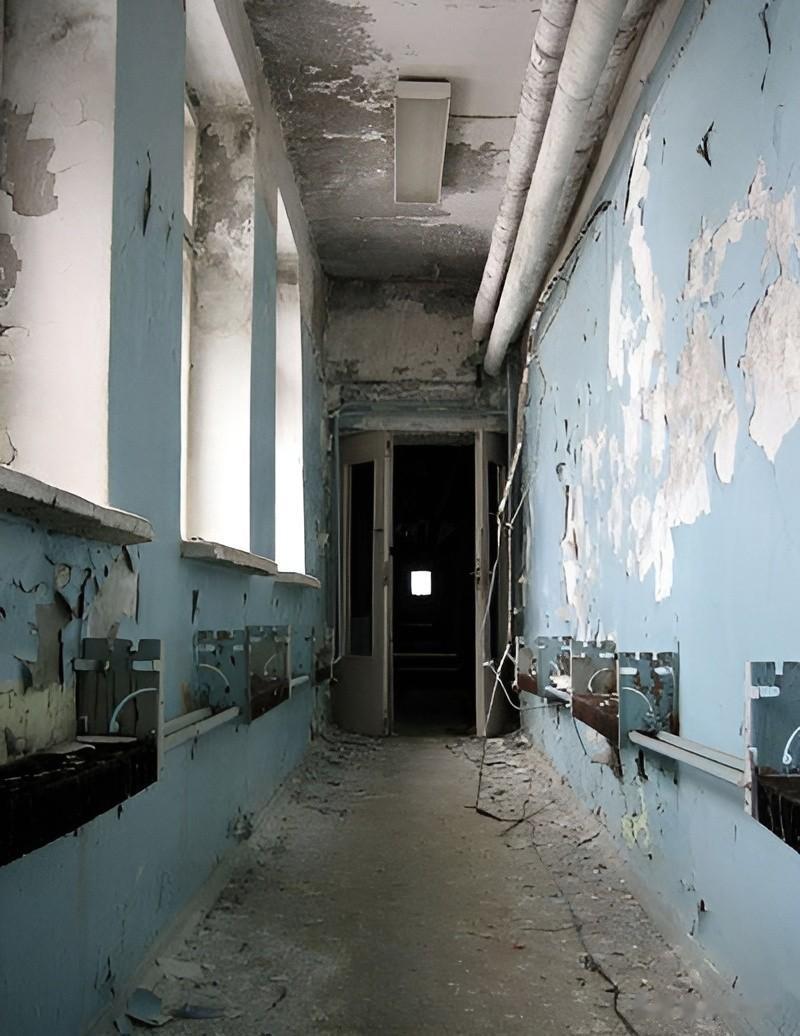 这是大楼内的一个通道,两侧安装着一些管道线路,看上去显得很狭窄,浅蓝色的墙漆也已脱落。处处透着一股人去楼空的凄凉感。