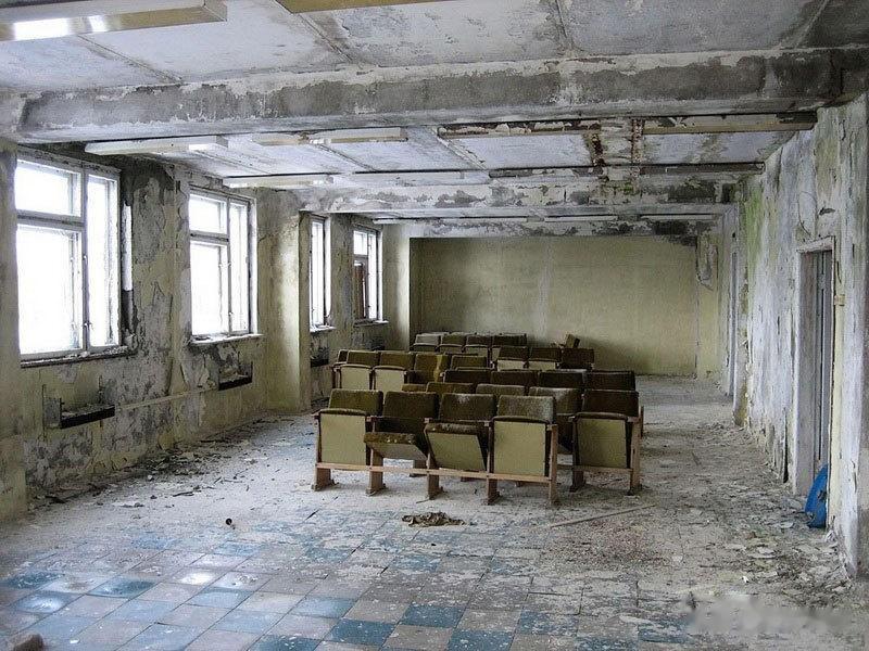 走进大楼,发现一个较大的房间,摆放着很多桌椅,这里应该是一个会议室。墙壁和屋顶斑驳,很难想象当年这里开会时的热闹场面。