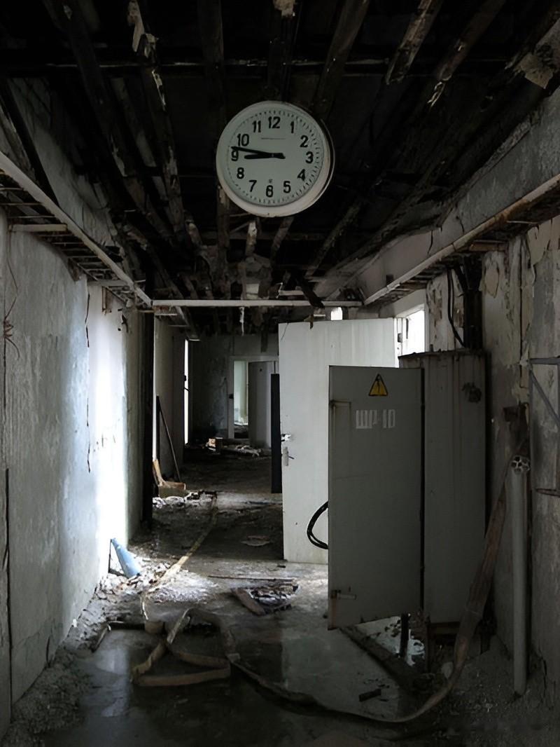 这里也是一个通道,旁边有配电箱。从屋顶上发黑的迹象看,这里可能发生过火灾,一根消防带还连接在消防栓上。奇怪的是,参观到这里之后,几名探险人员突然就撤离了这个废弃的基地,谁也不知道他们遇到了什么。