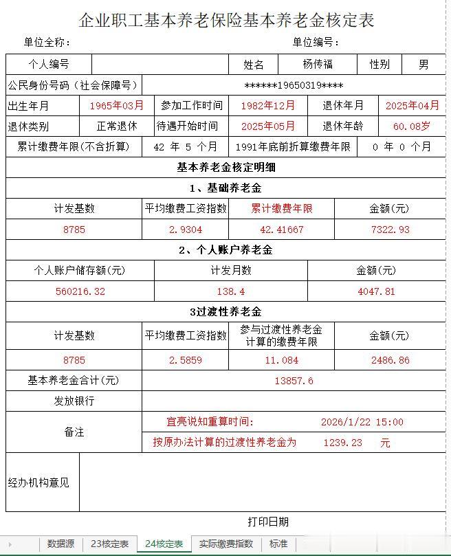 先请读者朋友们看看杨先生的预发养老金核定表,这是引用红中聊社保朋友文章中的图片: