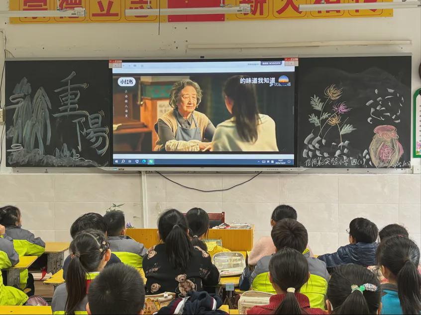 同时,学校组织学生集体观看重阳节主题影片。影片中,生动画面再现重阳登高赏菊习俗,温情片段讲述晚辈陪伴长辈的暖心故事,经典桥段传递孝亲敬老的传统美德,以直观形式让学生感悟孝意。此外,学生们还以手抄报、绘画、手工贺卡为载体,开展 “重阳敬老爱老” 主题创作 —— 手抄报图文并茂讲述重阳故事,绘画作品用稚拙笔触描绘祖孙温情,贺卡中真挚文字传递暖心祝福,每幅作品都是孝心的鲜活表达。