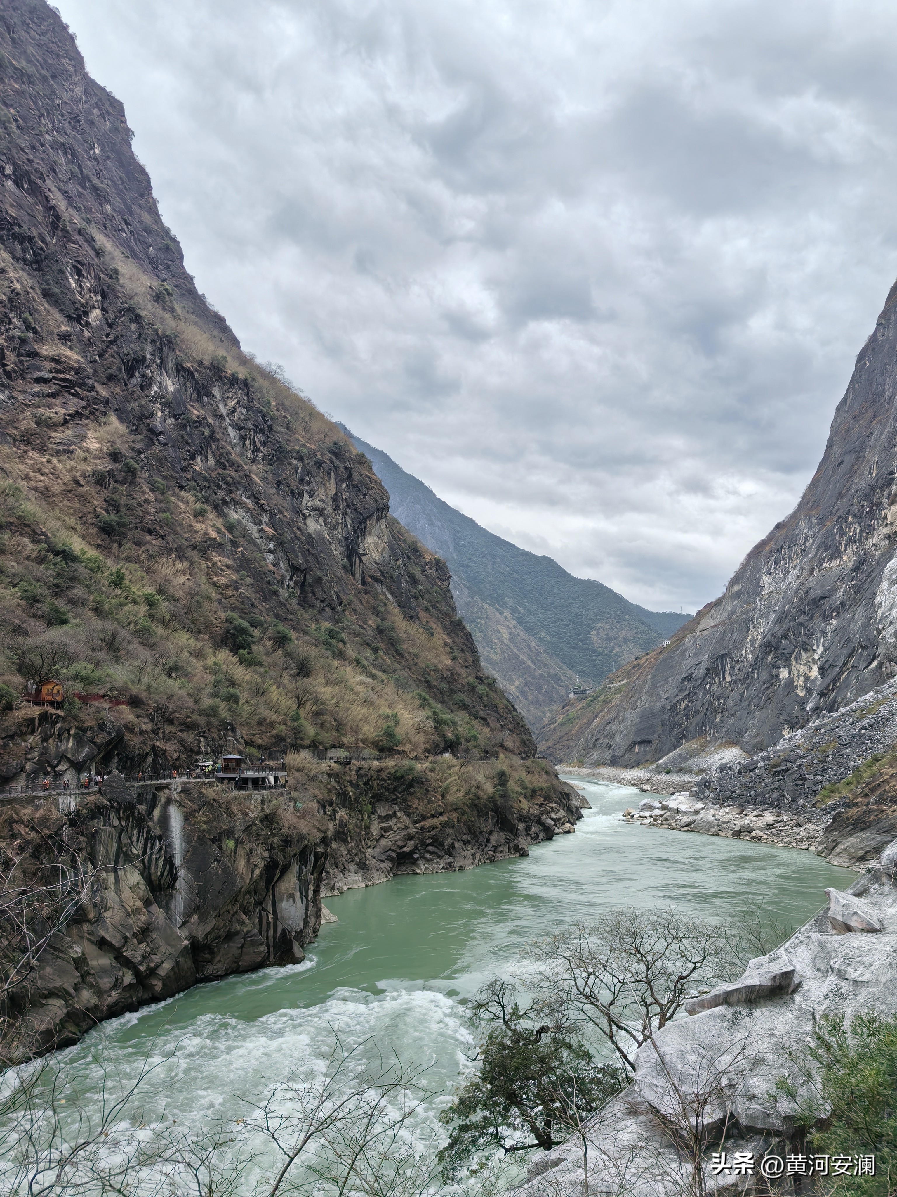 有意思的是,对岸就是丽江那边的虎跳峡景区,隔着江都能看见对面也是人头攒动,游客络绎不绝。两边隔着一条狂怒的金沙江,各自热闹,挺有意思的。