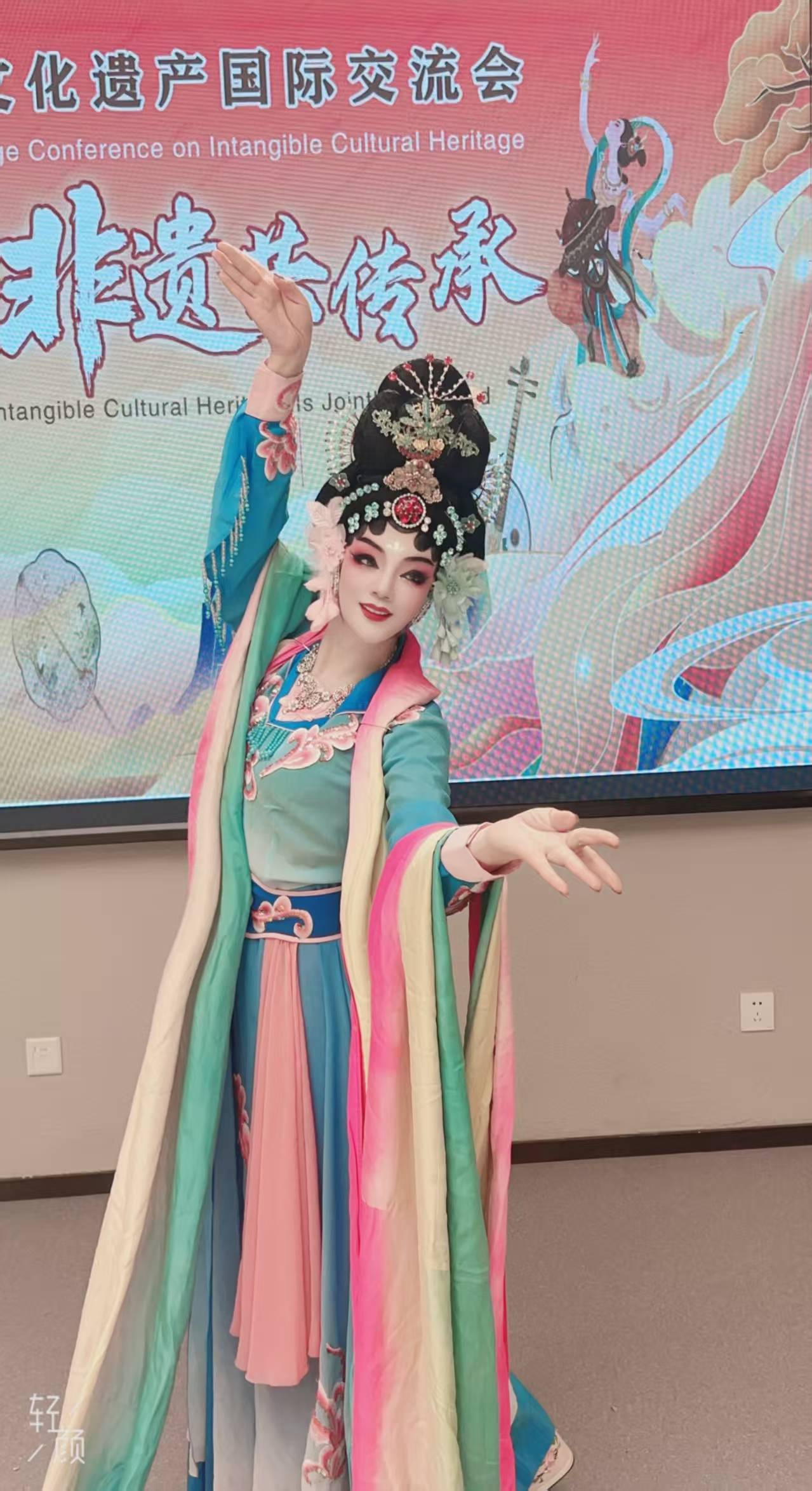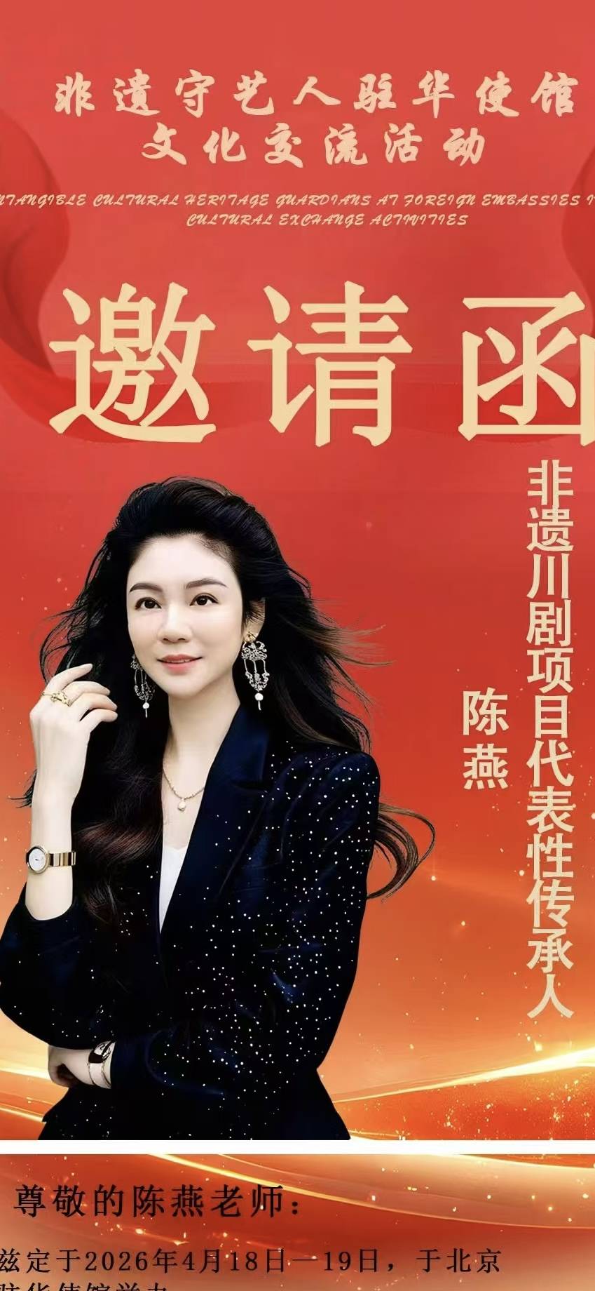近日,陈燕代表重庆盛青黛旅游集团旗下梨韵艺术团,在著名川剧演员岳霞老师的专业协助下,受邀走进外国驻华使馆区,倾情演绎戏曲歌舞《天女散花》。舞台上,她手执彩绸翩然起舞,水袖翻飞、绸带飘扬,将川剧的古典韵味与戏曲舞蹈的柔美雅致完美融合,以灵动婉转的表演,尽展中华传统戏曲的独特魅力与东方文化的深厚底蕴。