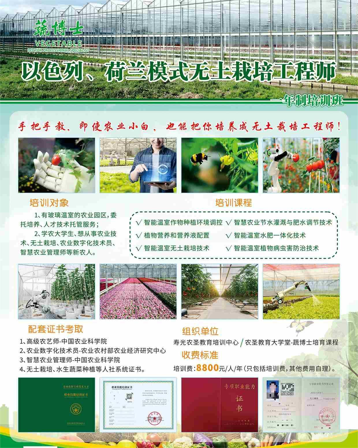 培训对象:有玻璃温室的农业园区,委托培养、人才技术托管服务+学农大学生、想从事农业技术、无土栽培、农业数字化技术员、智慧农业管理师等新农人组 织单位:寿光农圣教育培训中心、农圣教育大学堂-蔬博士培育课程