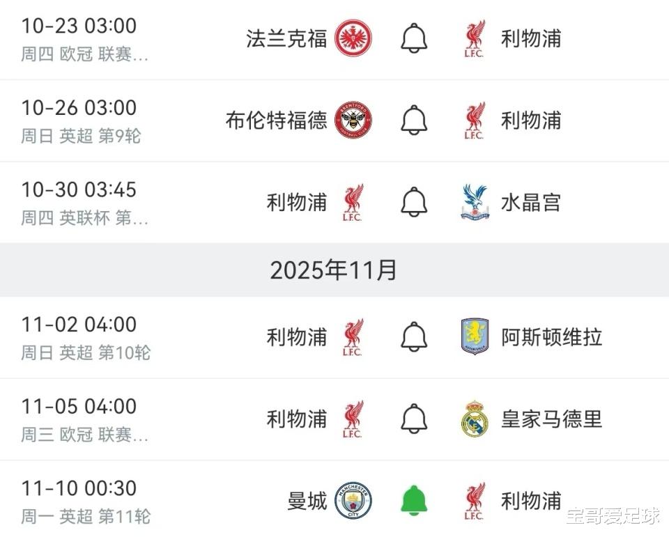 反而是斯洛特,自执教利物浦以来,耳边首次听到了下课声,虽然暂时不会有下课之忧,但是看看利物浦接下来的赛程,不由让人为斯洛特倒吸一口凉气。周中又是客场,对手是本赛季德甲进球第二多的法兰克福,就算赢不了利物浦,也能咬下红军两口肉;周末英超第9轮又是客场作战,对手是在第6轮英超主场3-1战胜曼联的布伦特福德;然后又要在英联杯主场迎战本赛季的克星水晶宫;英超第10轮,利物浦需要在主场迎战目前各项赛事5连胜的阿斯顿维拉;然后是周中主场对皇马的欧冠联赛第4轮;再接下来又将在英超第11轮前往客场挑战曼城。