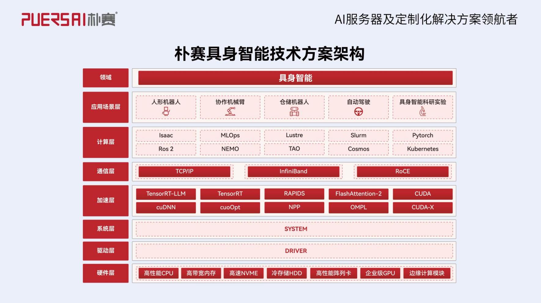 第三,把 “门槛” 打下来。以前做具身智能研发,要么用超算,成本高、调度慢;要么用普通服务器,性能不够、经常崩。朴赛这套方案是专门为具身智能场景定制的 “标准化算力底座”,硬件、架构、层叠都适配好了,科研机构、机器人公司不用再自己折腾硬件组合,拿来就能用,相当于把 “超级计算机” 做成了即用的 “工具箱”。