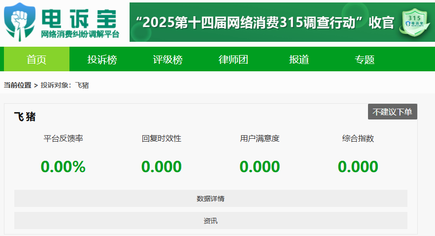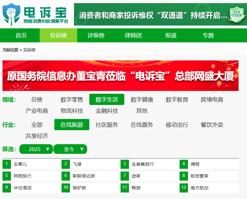 2025年至今,“电诉宝”受理投诉中涉及的数字生活中在线旅游领域用户有效投诉显示(依据投诉量排行),“飞猪”排名第2位。最新评级为“不建议下单”。除此之外,其他被投诉的类似平台还有:去哪儿、走着瞧旅行、携程、同程旅游、联联周边游、途家、航班管家、华住酒店、骑驴游、畅游、南方航空。