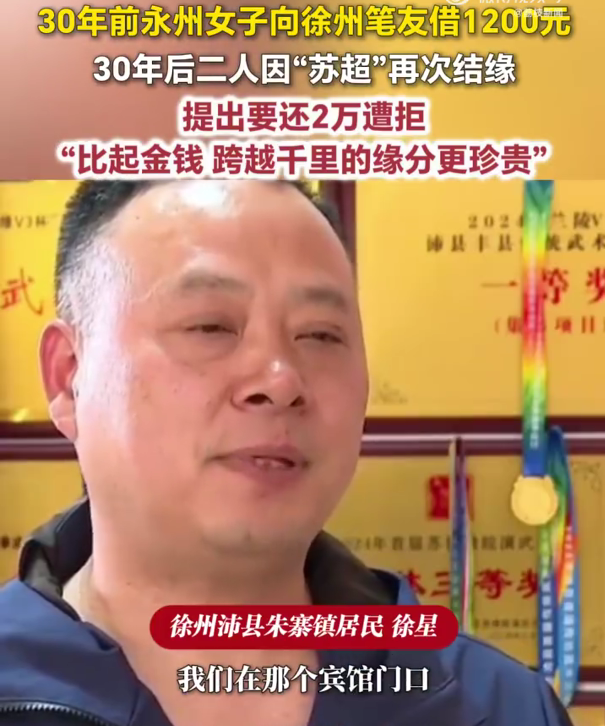 素未谋面的笔友,在30年前借出1200元巨款助人求学,两人失联近三十年,通过苏超话题互相找到对方,对方主动归还2万元却遭婉拒,这段跨越时空的纯粹情谊引发全网热议。