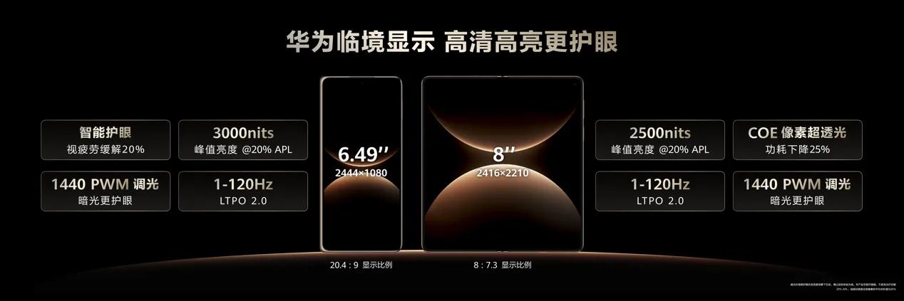 屏幕方面,华为Mate X7搭载华为全新临境显示技术,内外屏皆具备高清晰、高亮度、高刷新率和高保真的卓越显示效果。外屏6.49英寸,分辨率达2444×1080,峰值亮度可达3000 nits;内屏8英寸、分辨率为2416×2210,峰值亮度亦达到2500 nits,且双屏均支持 1 - 120Hz 自适应刷新率。如此出色的屏幕素质,为用户带来了震撼临场的真实感,无论是观看高清视频、畅玩大型游戏,还是进行商务办公,都能享受到极致的视觉体验。