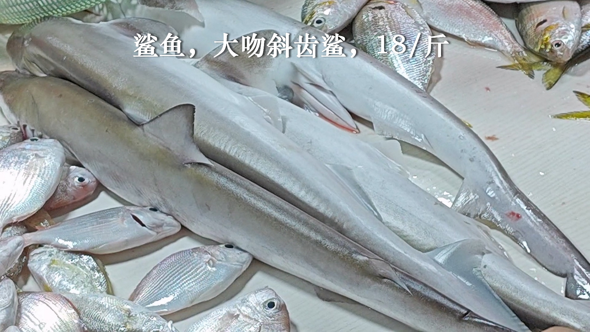19、鲨鱼,大吻斜齿鲨,18/斤。鲨鱼有尿骚味,皮有沙,所以便宜,但有人喜欢。