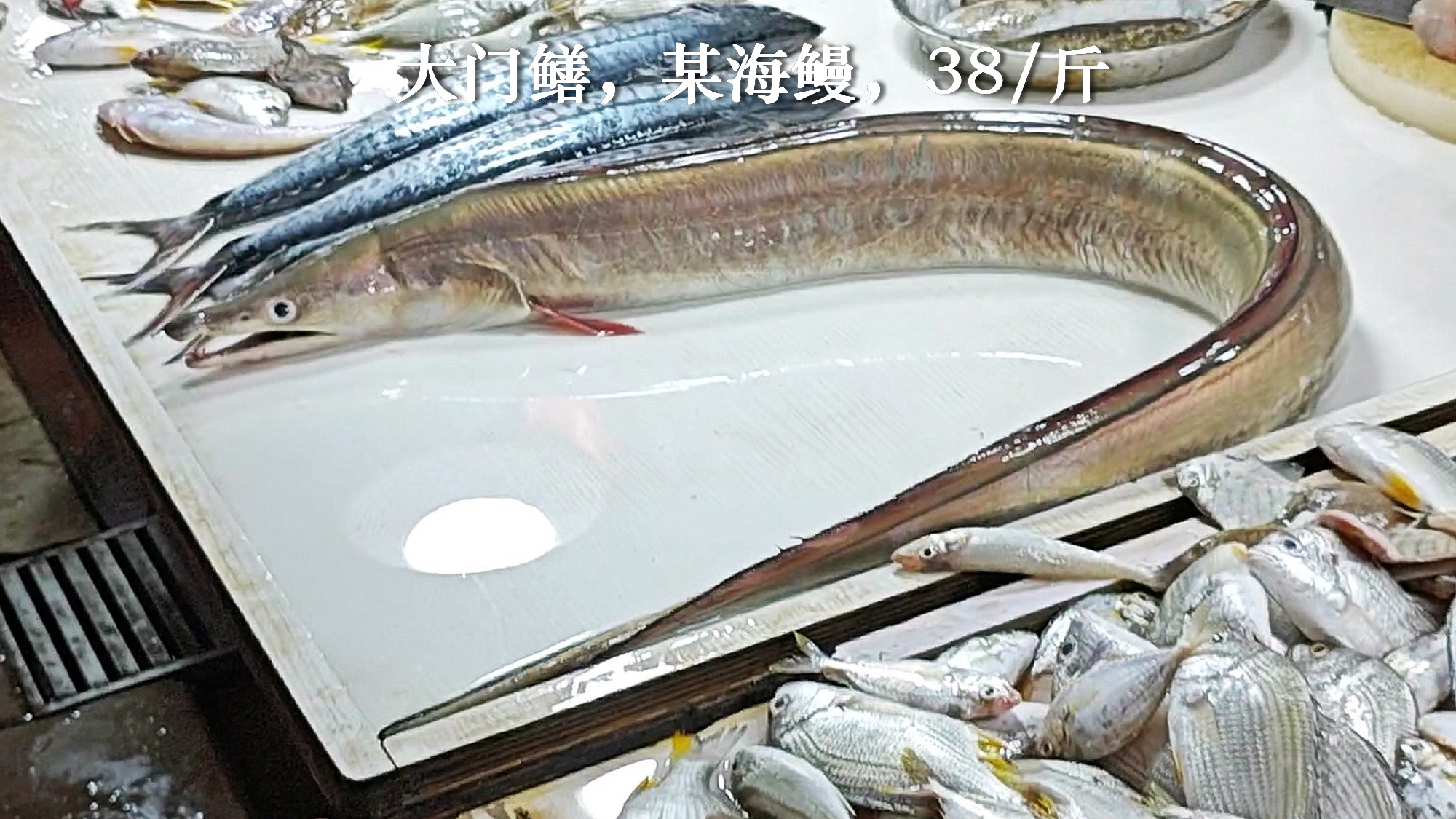 13、大门鳝,某海鳗,38/斤。它鱼味有点淡,小刺多,懒得吃,本地晒鱼干较多。