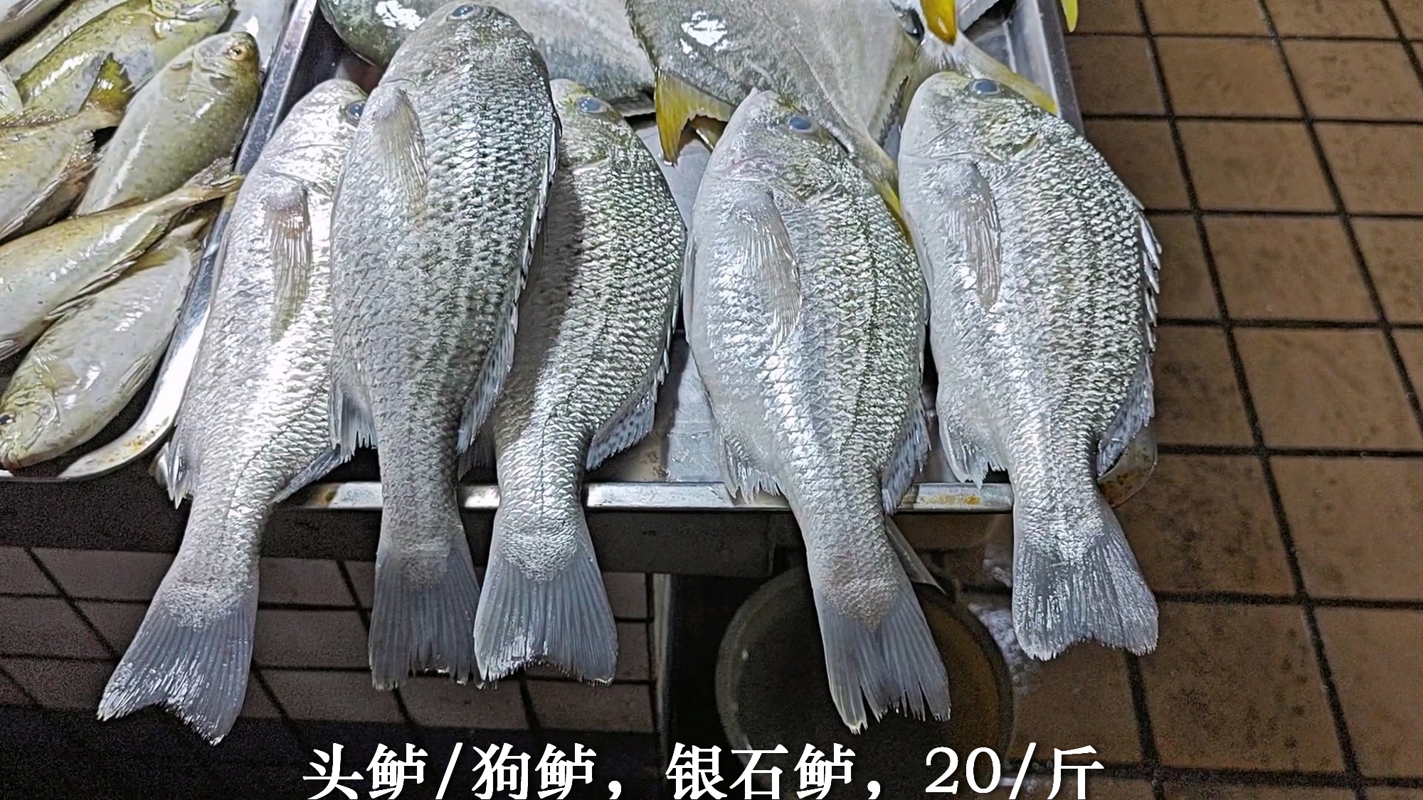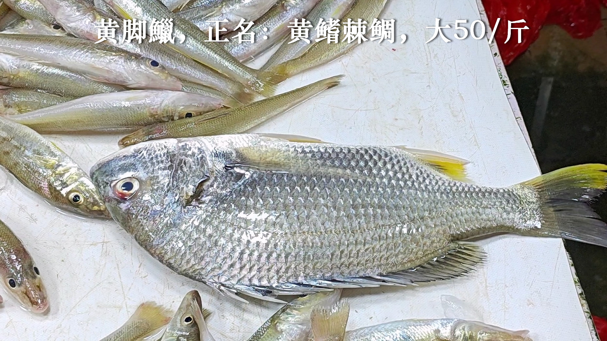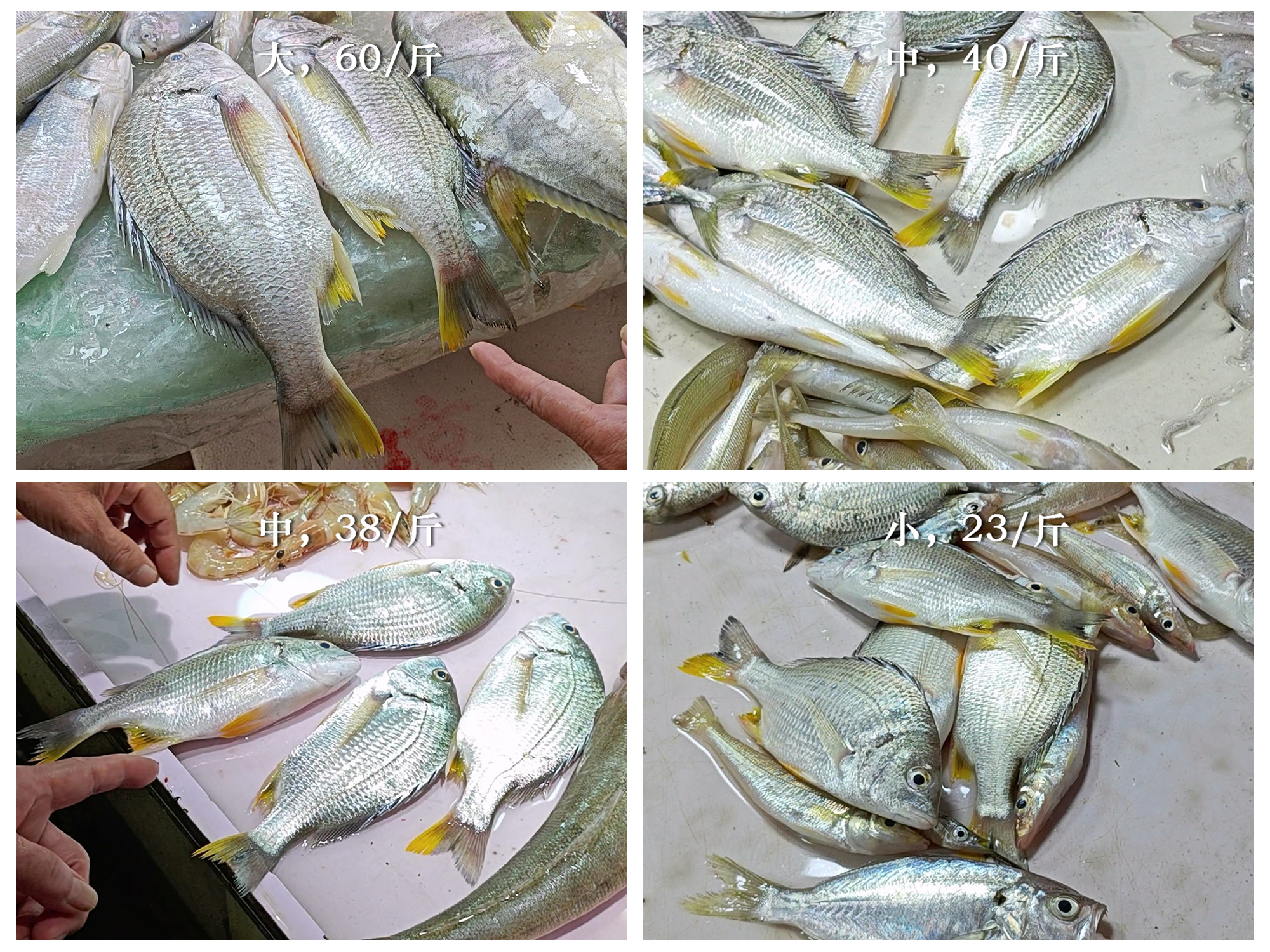 4、黄脚鱲,正名:黄鳍棘鲷,15-60/斤。最近黄脚鱲上水非常多,网的,钓的都很多,但本地人喜爱,多少都消化掉。最大的60元一斤,不贵,其次略小50一斤那条很不错。最小的是15元一斤,也不错。中间部分的定价,有23的,38的,40的,没有完全弄懂定价规律。