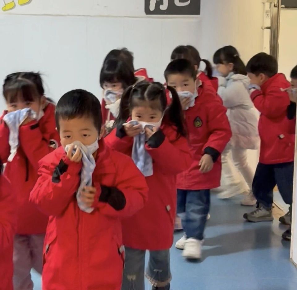 全园师生齐聚操场,开启了紧张又有序的消防实战演练。在教官的专业指导下,现场模拟烟雾场景,配合广播指引,孩子们用湿毛巾捂住口鼻、弯腰低头,跟着老师有序撤离。