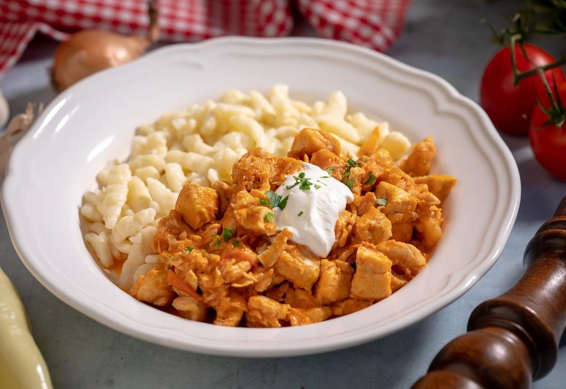 再来一道红椒鸡(Csirkepaprikás),鸡肉块用洋葱和甜红椒粉炒香,炖煮后拌入酸奶油,酱汁顺滑醇厚。