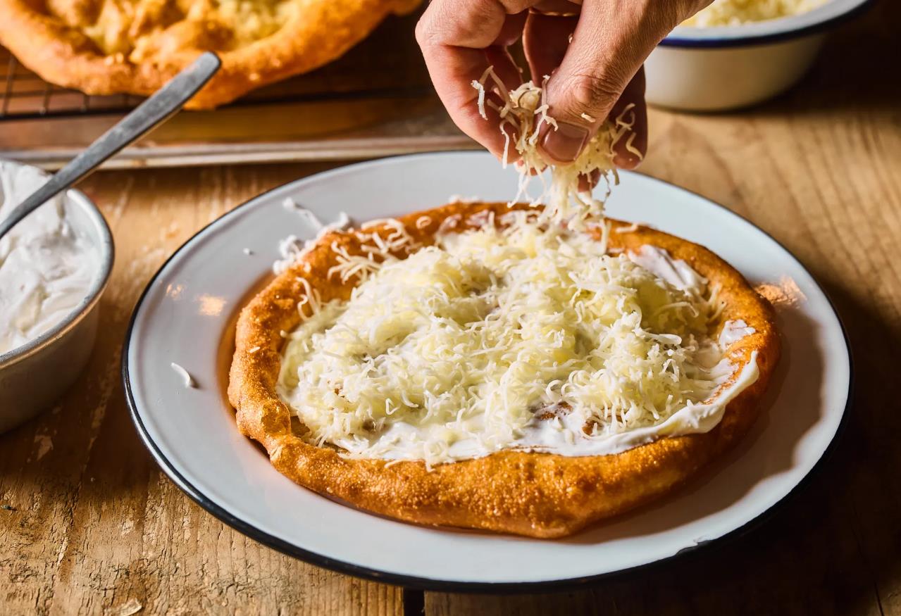 匈牙利还有一道街头小吃——兰戈斯(Lángos),发酵面团炸至外酥内软,刷上蒜酱、铺上酸奶油和奶酪碎,你可以把它当做是匈牙利版的“炸油饼”了。它还可以搭配蒜蓉酸奶油,风味十足。