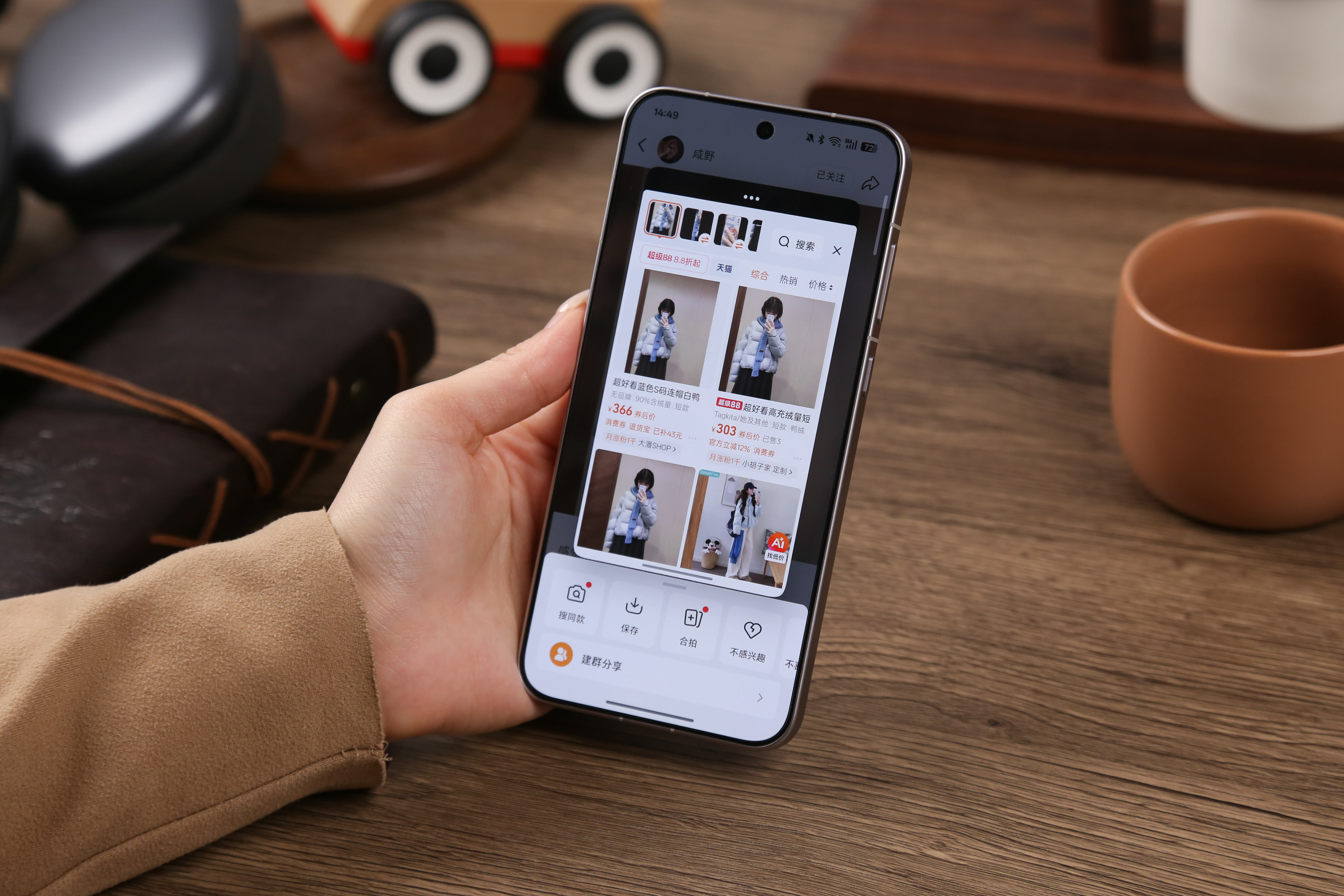 现在,ColorOS的「内容传送门」直接让流程简化成了“傻子操作”:按住图片一拖,屏幕边缘秒变服务小抽屉,“搜同款”、“问AI”、“分享”这些选项直接蹦到你眼前。拖到“搜同款”,结果直接就出来了。