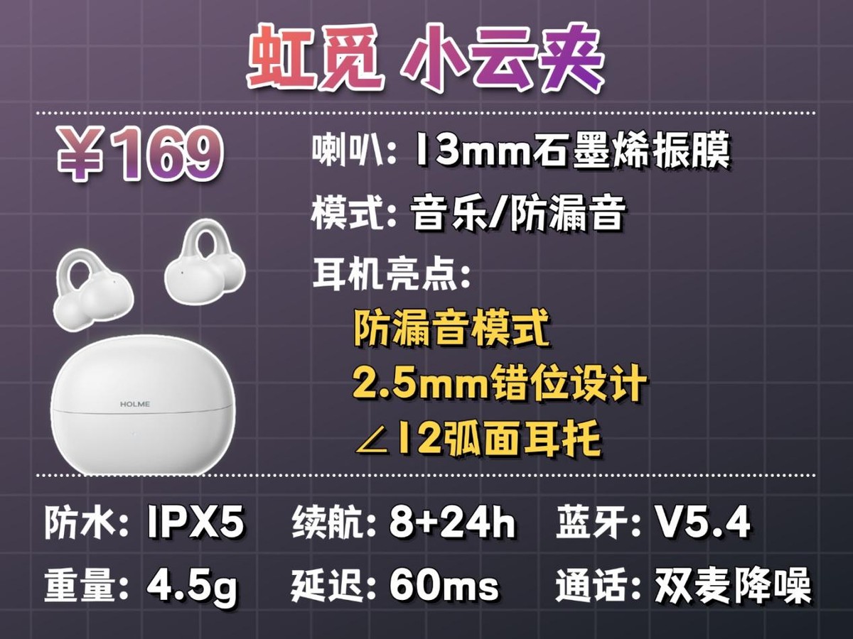 这副耳夹戴着很舒服,4.5克超轻机身配合2.5mm错位设计,完美避开耳朵敏感区,长时间使用也不会胀痛。音质上13mm石墨烯振膜让声音细节很丰富,低音扎实不闷,人声清晰自然,全景空间音效让听歌更有沉浸感。配置很实用,防漏音模式在图书馆用特别贴心,24小时续航足够日常使用,IPX5防水无惧汗水,双设备切换也很方便。在这个价位能把佩戴舒适度和防漏音都做好,性价比确实很高。