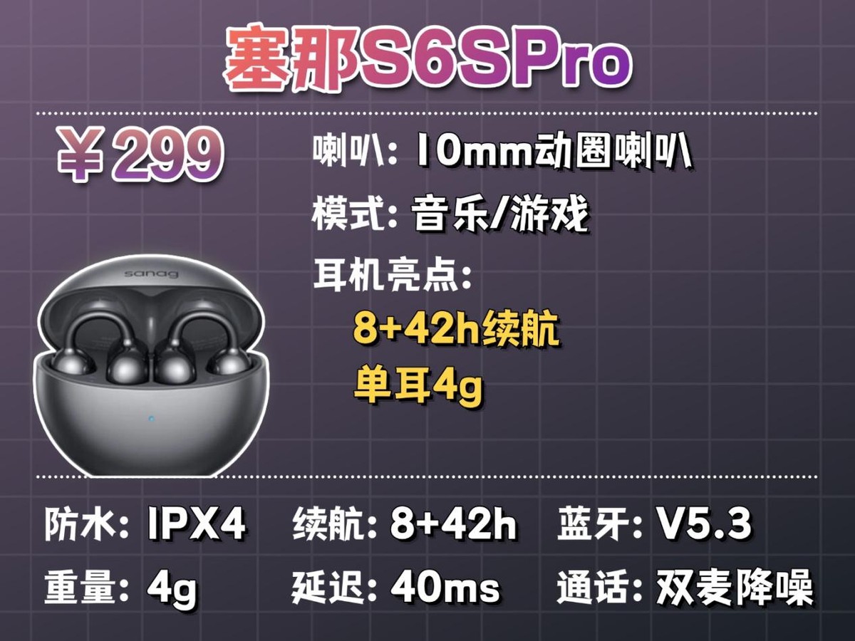 塞那S6SPro佩戴采用C形桥与贴合耳廓设计,4克超轻机身佩戴时几乎感觉不到存在。音质配置10mm动圈单元与全景音增强技术,人声表现清晰自然,适合日常听歌看视频,不过在细节呈现和低音下潜方面较为普通。性能方面42小时总续航表现突出,40ms低延迟优化游戏体验,IPX4防水应对日常汗水,双麦ENC保障通话清晰度。虽然不支持一拖二且音质表现中规中矩,但超长续航与极致轻巧的佩戴感,让它成为注重实用性的选择。