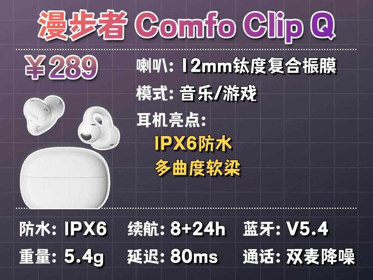 漫步者Comfo Clip Q在佩戴上采用小圆头设计与多曲度软梁,5.4克机身配合柔性结构能均匀分散耳部压力,长时间使用依然保持舒适。音质表现搭载12mm钛度复合振膜,人声部分清晰自然,中频表现稳定,适合日常聆听使用。配置方面具备IPX6高级防水,可应对雨水和汗水侵袭,24小时总续航满足通勤需求,双麦ENC通话降噪确保沟通清晰度。虽然音质细节表现中规中矩,但优秀的佩戴舒适度和可靠的防水性能,使其成为适合日常通勤和运动使用的实用选择。