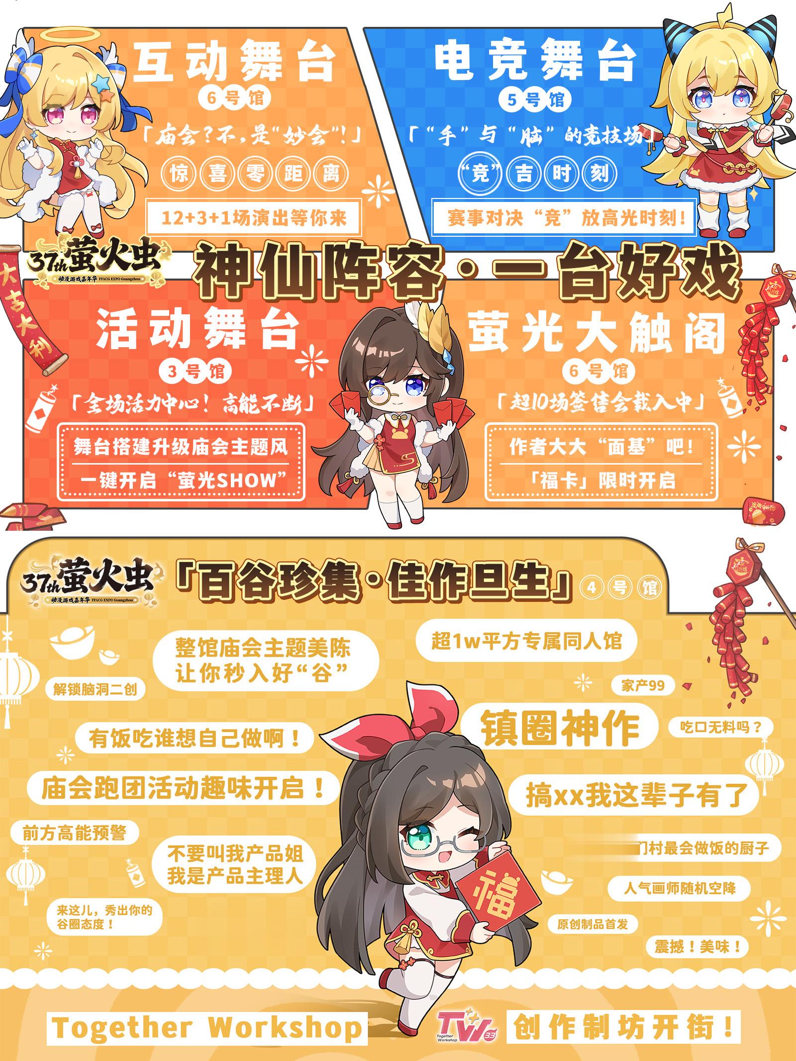 六大展馆齐开放,「萤火庙会」畅玩无极限。展会现场不仅汇聚萤之町、UPW 游戏专区、虚偶专区、WonderHobby 模玩区等热门板块,火爆游戏与超高人气 IP 集体集结,游玩秘笈已备好待大家开启;更有大会场刊活动、萤光游乐园、萤火食肆组成庙会三重好运,吃、喝、玩、乐一站式全体验,承包你的元旦欢乐时光。
