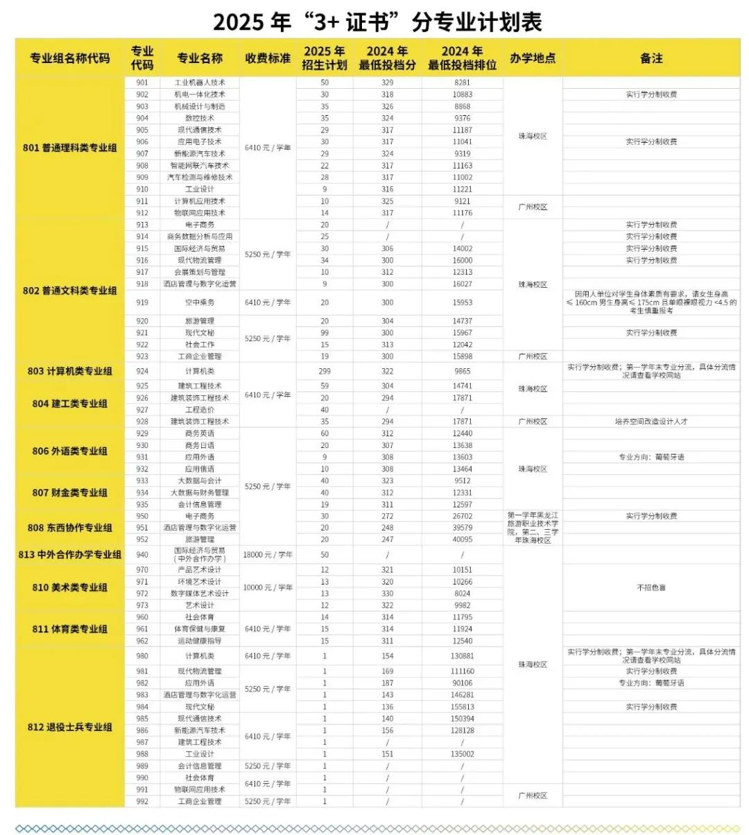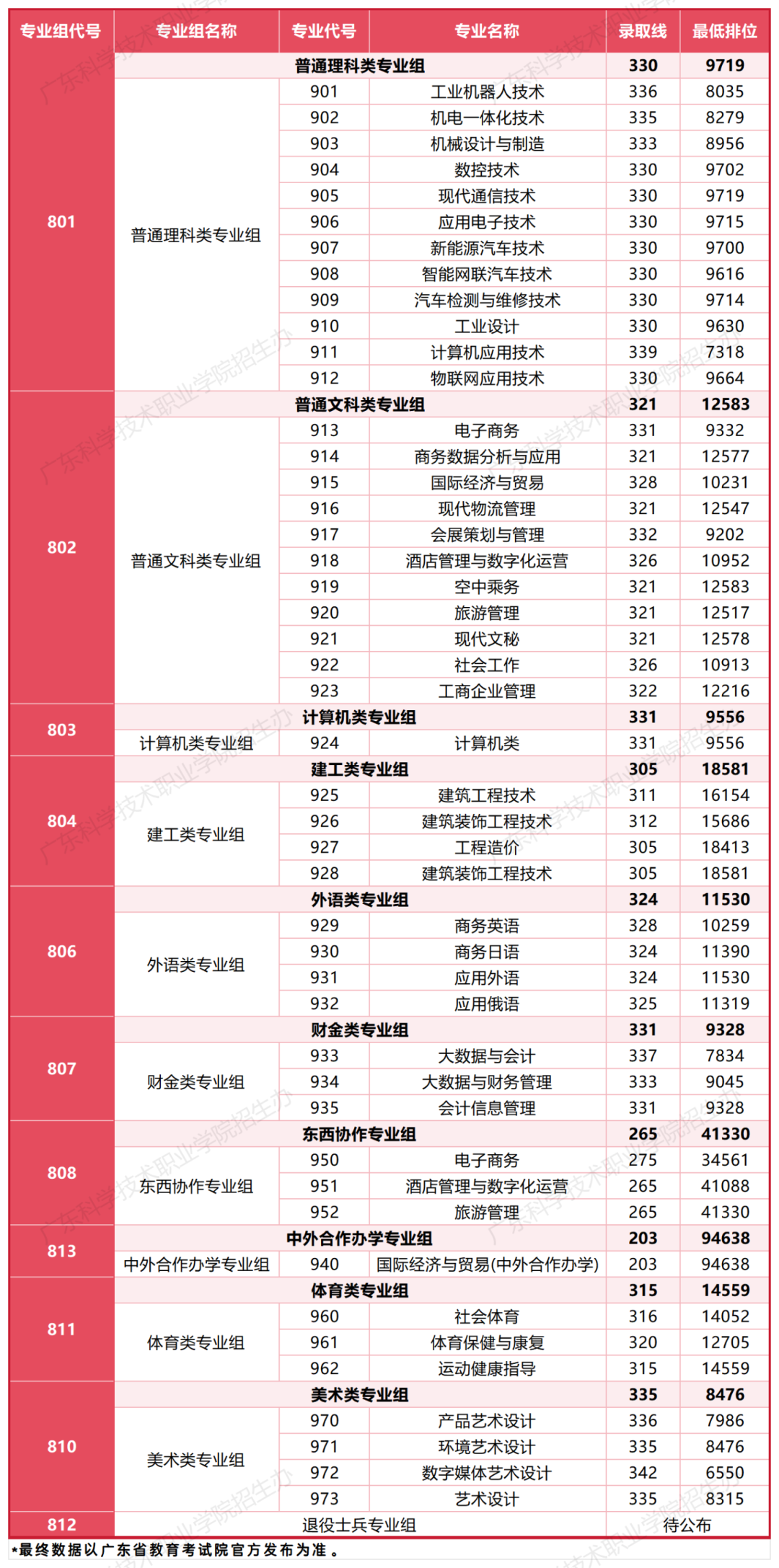 广交在25年3+证书高职高考中,最低分专业组为806专业组,投档最低分为213分,投档最低排位为85512名!