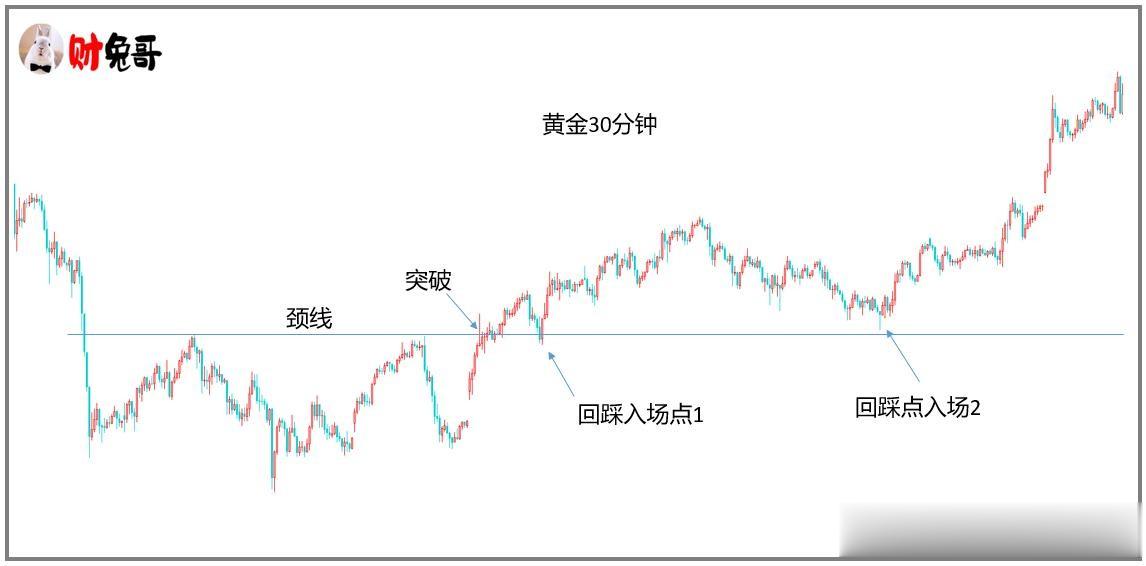 由此,我们只要盯住4小时的颈线位置,然后在30分钟周期找到的交易机会,如图(3)所示: