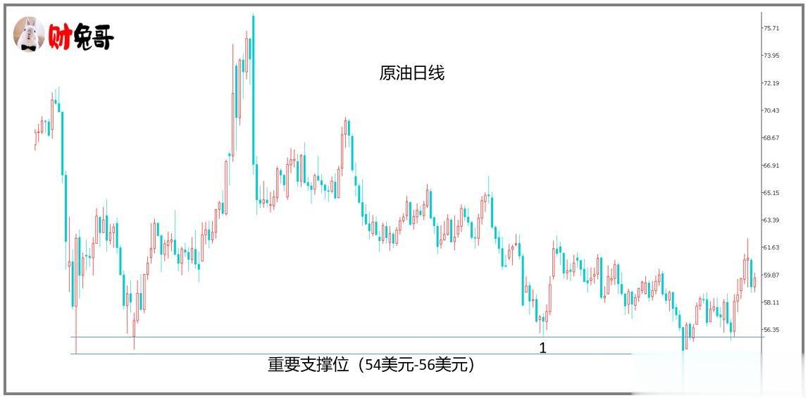 原油日线走势,我们找到一个重要的支撑位(54-56美元区间),后市价格只要不有效突破,每一次测试失败都是做多的机会,于是它的方向是多头。