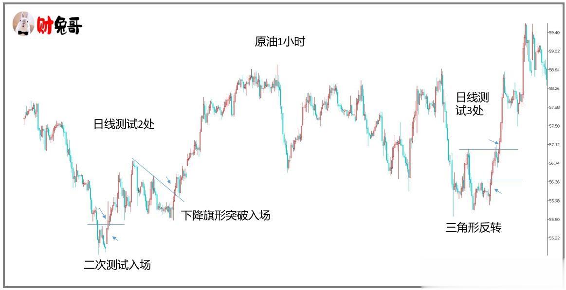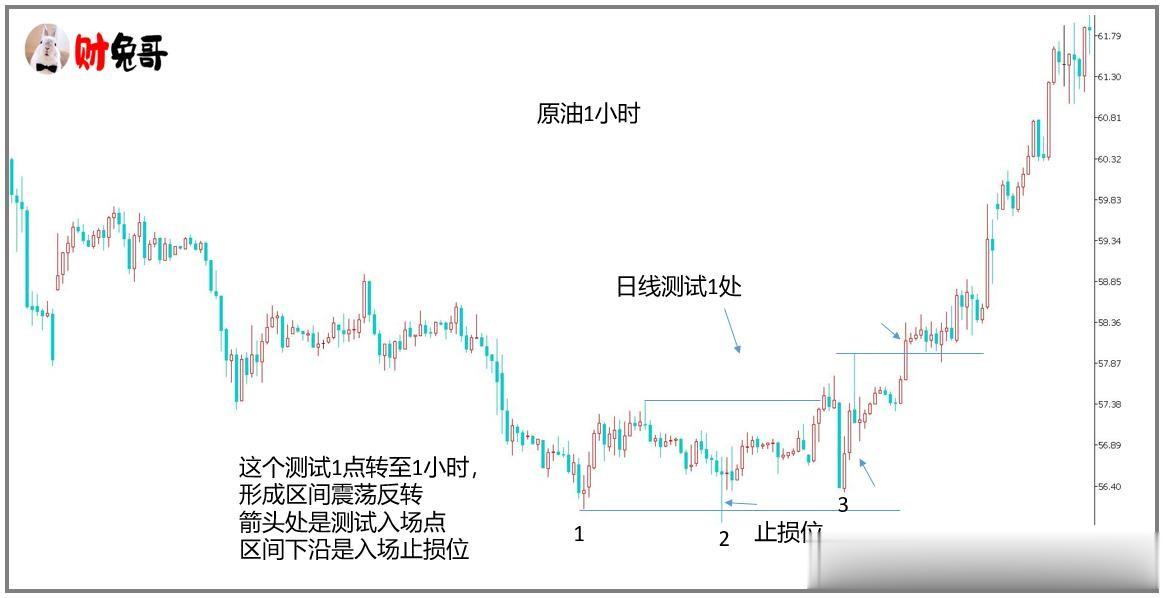 日线级别的关键位和方向我们已经确立,日线级别后市有3次测试,于是转至日线以下的小级别周期入场,我们去寻找这3次的小周期入场点,这里我们选择1小时周期,如图(5)和图(6)所示:
