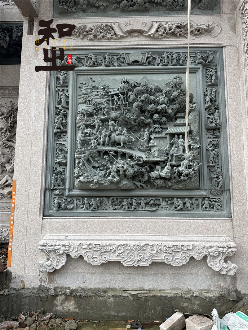 在雕刻工艺上,潮汕石雕工匠们技艺高超,将多种技法巧妙融合。圆雕技法用于突出主要人物或神兽形象,使其具有强烈的立体感;高浮雕增加画面的层次感与深度,营造出虚实相生的效果;镂空雕则赋予浮雕通透灵动之感,常用于雕刻窗棂、屏风等部位,使石雕更加精美绝伦。在细节处理上,工匠们对人物的服饰纹理、面部表情,以及花卉的花瓣脉络、鸟兽的羽毛鳞片等都精心雕琢,每一处细节都细腻入微,展现出工匠们的精湛技艺与匠心精神。