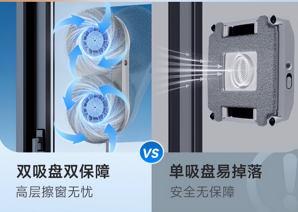 安全永远是底线。除了必备的安全扣,一定要选双重供电(电源线 + 内置电池) 的机型。就算突然断电,电池也能维持 15-30 分钟吸力,足够你取下机器。有防碰撞传感器的机型更稳妥,能减少卡边、坠机的风险。