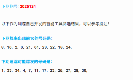 本期分析:本期的冷热分布,本期的遗漏大于9的号码有11个,上期的冷码开出了2个号码,温码开出了1个号码,上期热码也开出了2个号码,上期冷码如期开出2个,热码也是2个号码,本期是需要防一下热码的,这样来说才对,本期不是热码发威,就是冷码扎堆,所以热码和冷码是本期需要考虑的重点,各自防2到3个号码,温码考虑1个号码左右即可。(热码:蝴蝶算法中概率前10的号码,只有10个;冷码:遗漏大于等于9的号码;温码:排除前2类之外的剩下的号码,都是温码;)
