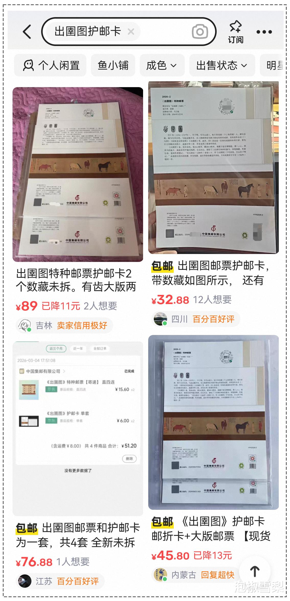 没有了数字藏品,护邮卡还卖的动吗?从每人限购10套,以及开售半小时后还有货的情形看,销售情况应该不会太好,而二级市场所涌现的大量《出圉图》护邮卡现货,也从侧面说明大多数购买者只是为了数藏炒作,护邮卡本身对于集邮人士的吸引不是很大。