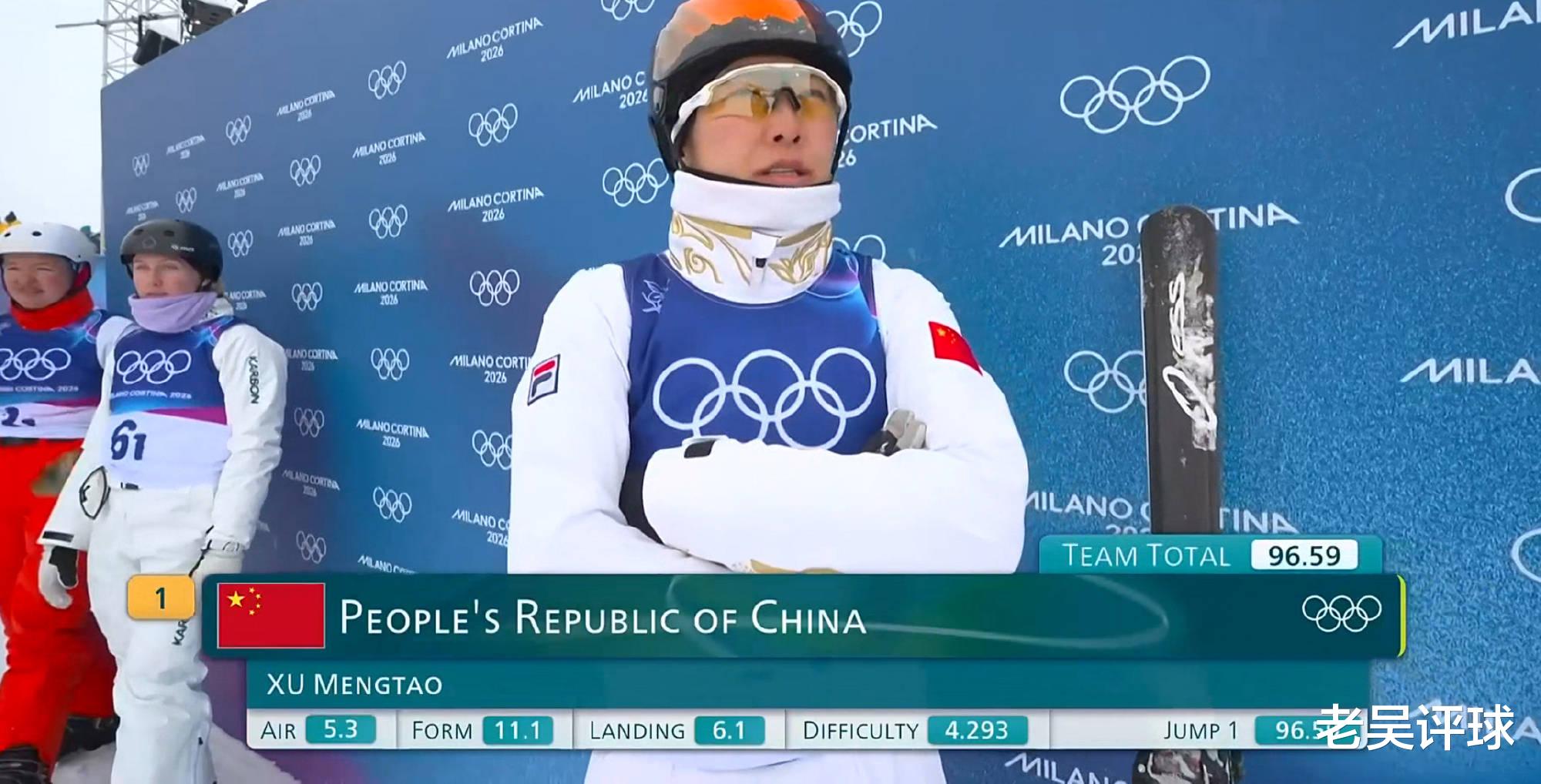 自由式滑雪空中技巧混团决赛第二轮,徐梦桃登场,拿到96.59分,比一轮的那一跳好多了。