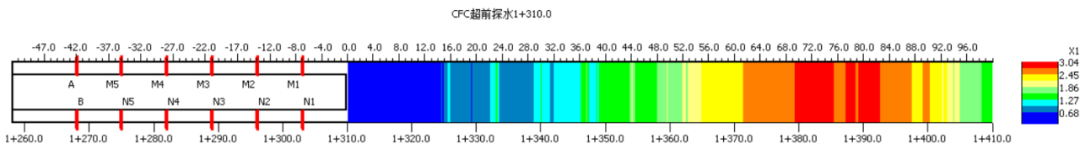 结果:其中 69-83m 范围内围岩含水量较大,属于需要重点警惕的潜在水害风险区域;其余地段含水量较小,水文条件相对稳定,可在做好常规防护的前提下推进掘进作业。