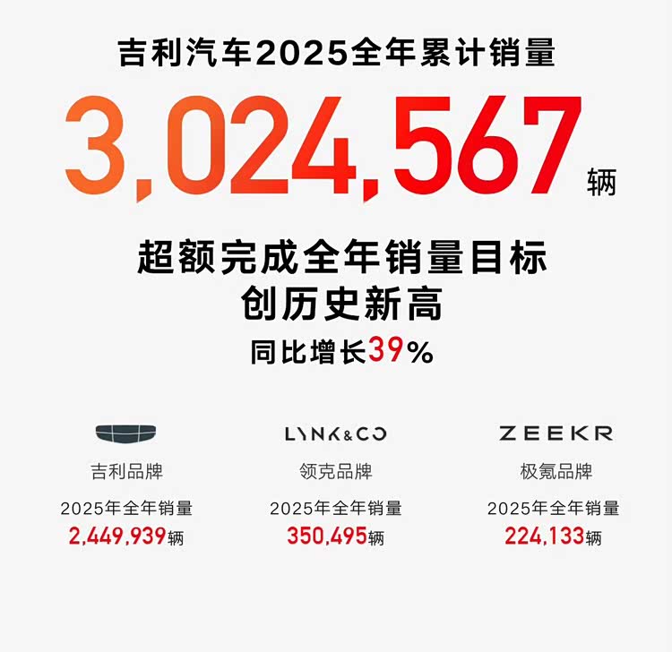 作为对手的吉利也不示弱,2025年累计销量3024567辆,也是历史新高,而且2026年的目标是345万辆,从各品牌销量来看,领克和极氪分别卖了350495辆和224133辆,银河系列车型算是增速最高的,累计销量超123万辆,同比增长150%。