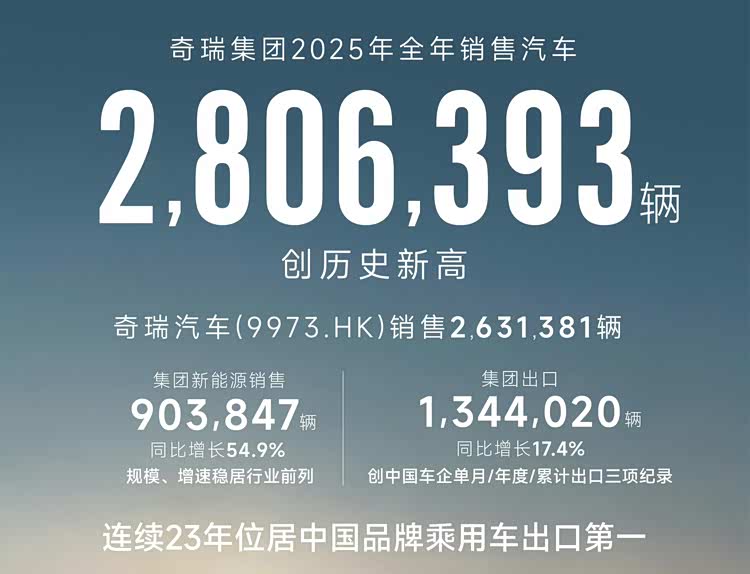 还有一个老牌自主品牌,也就是奇瑞,大家都知道奇瑞的出口做的不错,2025年全年累计销售汽车2806393辆,其中出口量为1344020辆,已经是连续23年位居中国品牌乘用车出口第一。