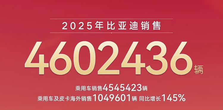 先来说下比亚迪,毕竟是目前的销量领头羊,2025年销售4602436辆,其中乘用车及皮卡海外销售1049601辆,纯电动汽车销量225.67万辆,登顶全球电动汽车销量榜首,在2025年依旧领跑销量榜。